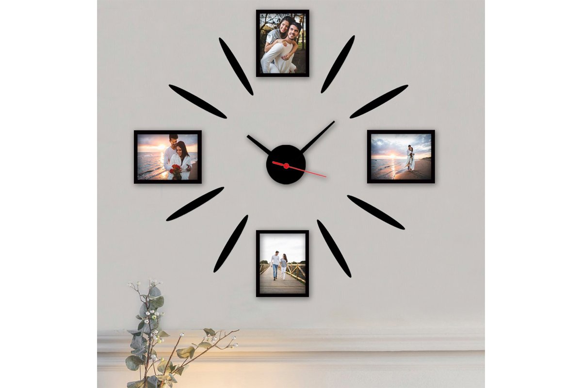 Horloge avec 4 cadres photos - 50 x 50 cm - Noir