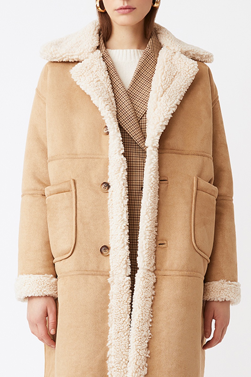 Empiècements en fourrure synthétique à l'encolure, sur les manches, devant et à la base. Fermeture boutonnée.
