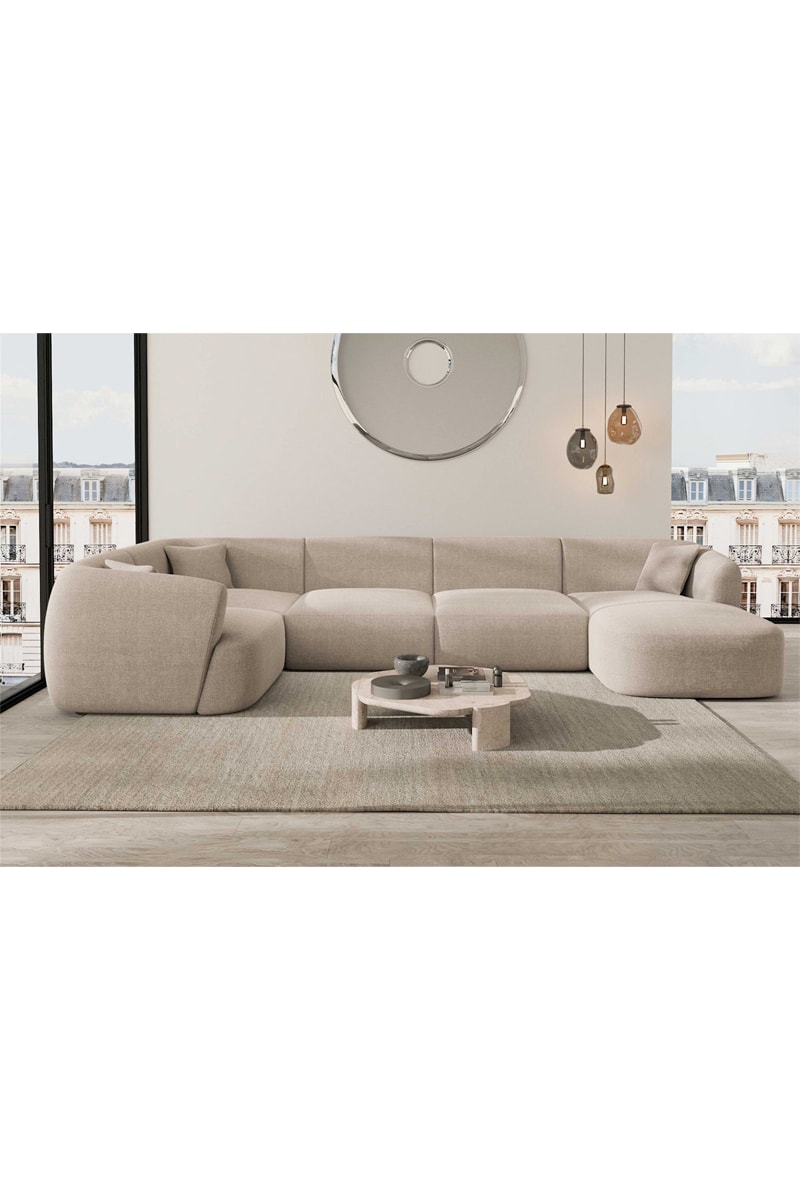 Canapé d'angle gauche panoramique Ozura - Beige - 7 places - En tissu structurel