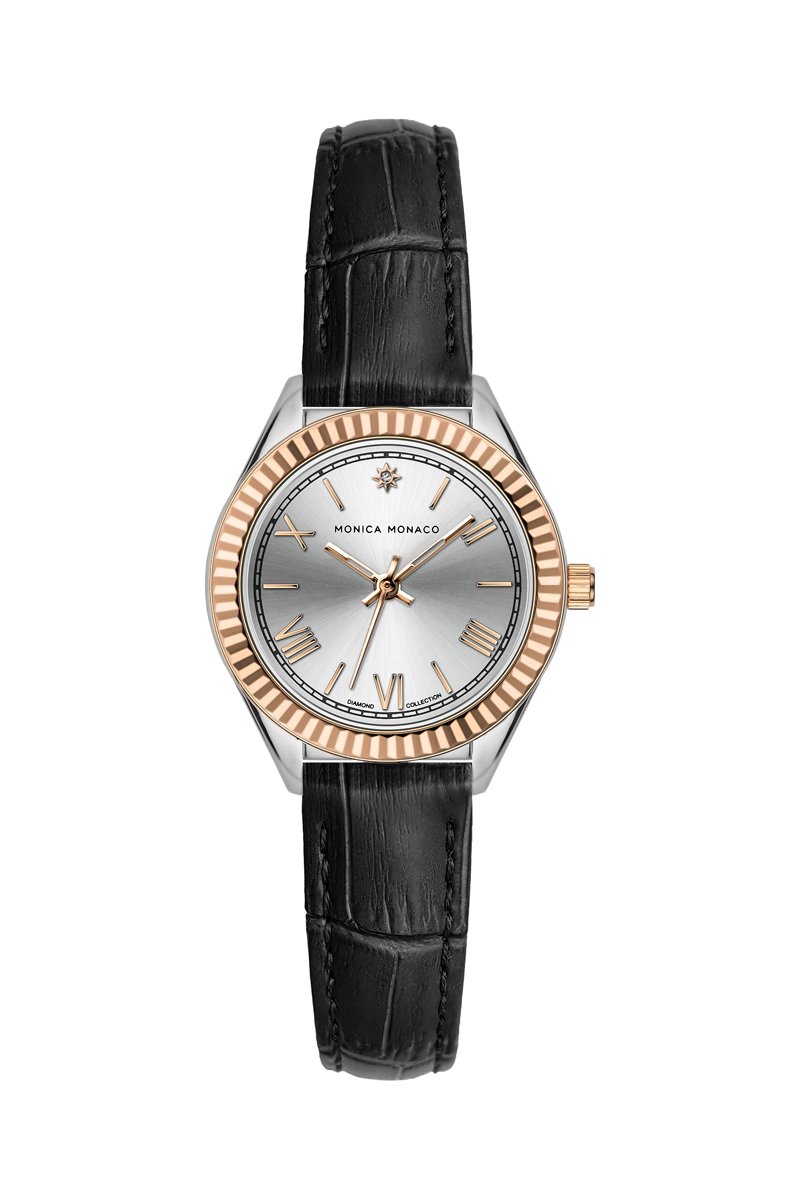 Montre à quartz en cuir et diamant - Noir et doré rose - Monica Monaco