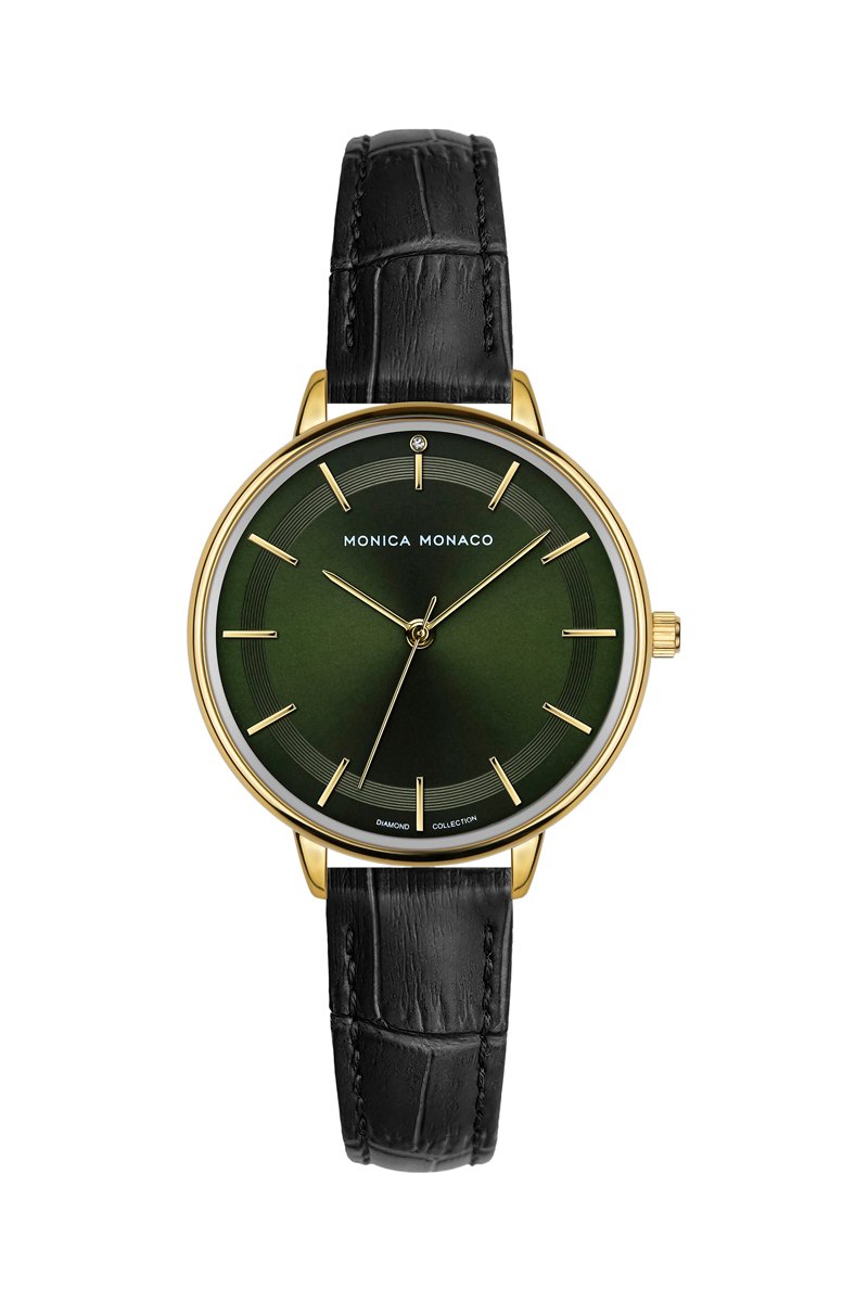 Montre à quartz en cuir et diamant - Noir et doré - Monica Monaco