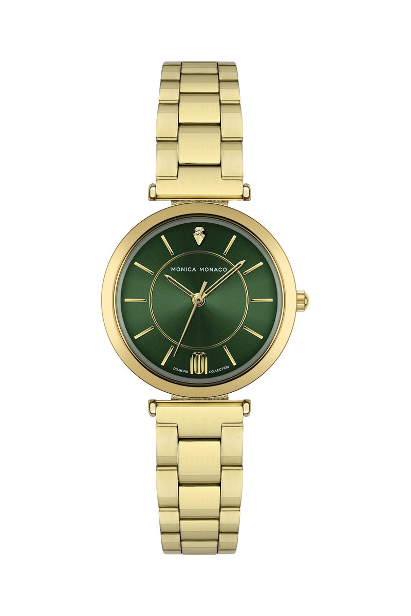 Montre à quartz en acier et diamant - Doré et vert foncé - Monica Monaco