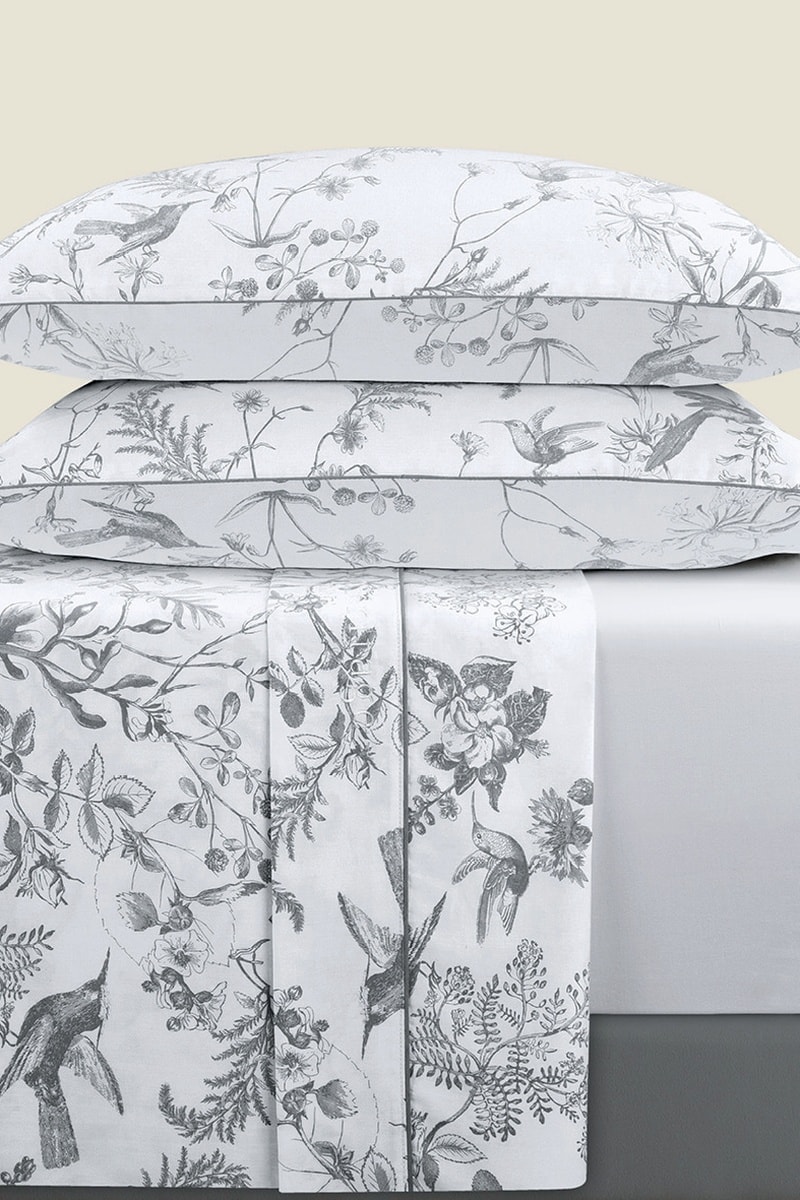 Parure de draps en satin de coton 80 fils/cm² Colibri floral - Blanc et gris