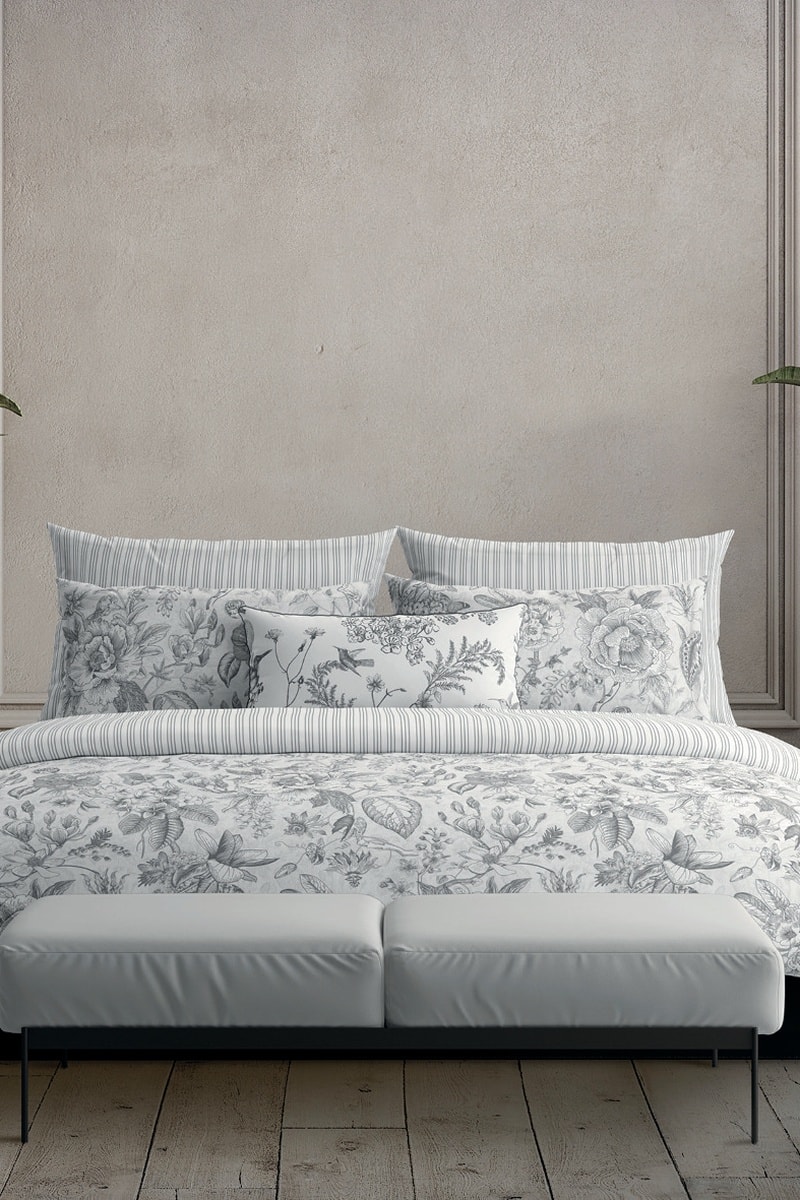 Parure de couette en satin de coton 80 fils/cm² Fleurs esquissées - Blanc et gris