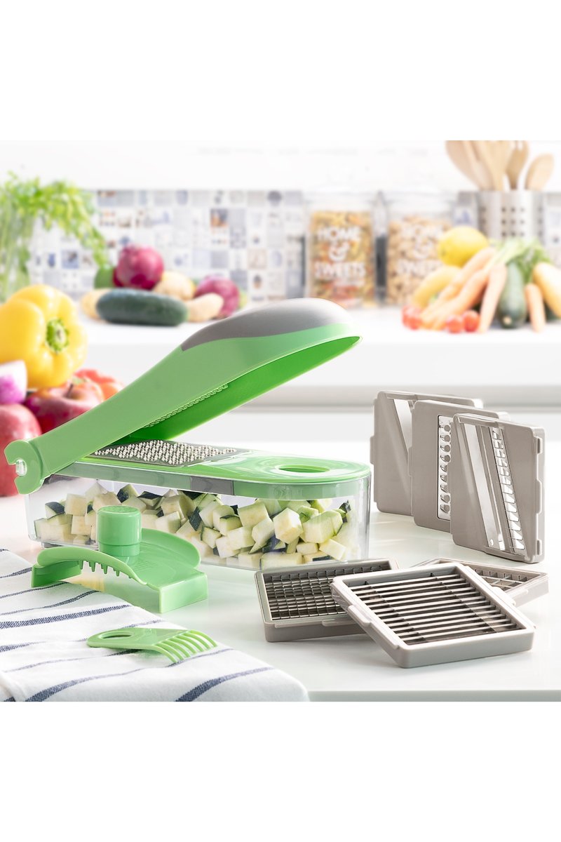 Réalise 7 types de coupes uniformes et précises d'un seul mouvement : gros dés, petits dés, bandes épaisses (bâtonnets), tranches, julienne, râpé et déchiqueté.