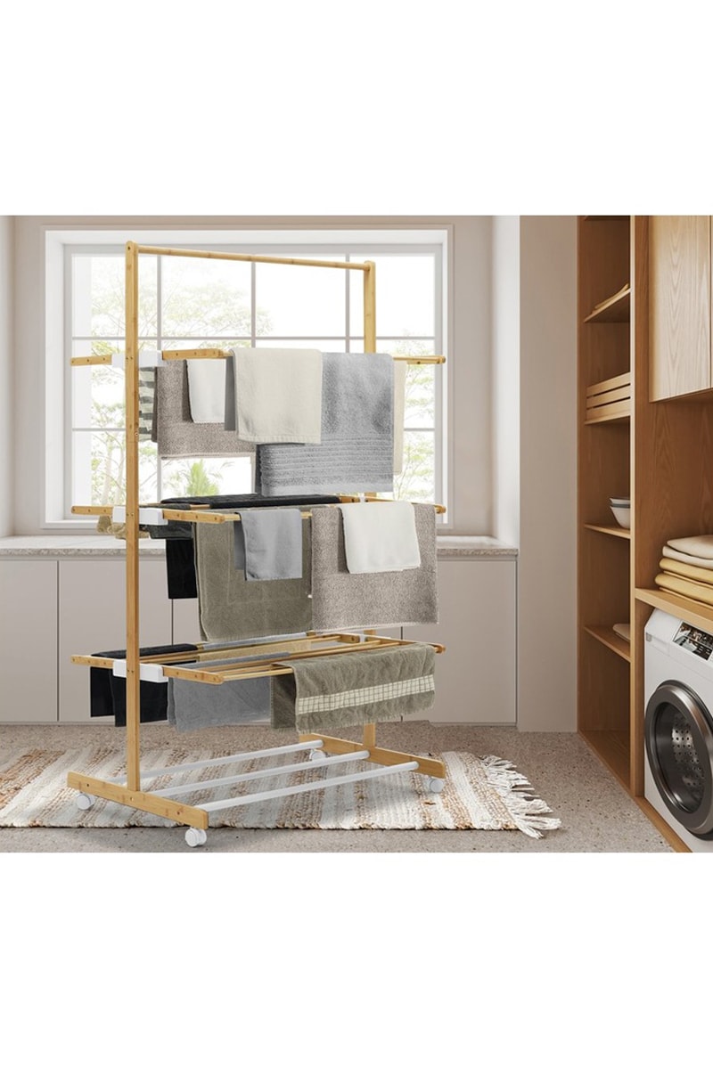 Séchoir 3 niveaux pliable en bambou.