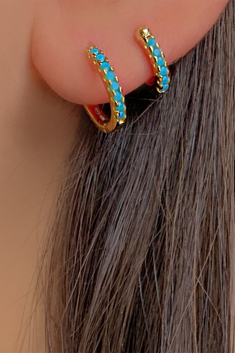 Créoles en argent doré à l'or jaune serties de turquoises synthétiques.
