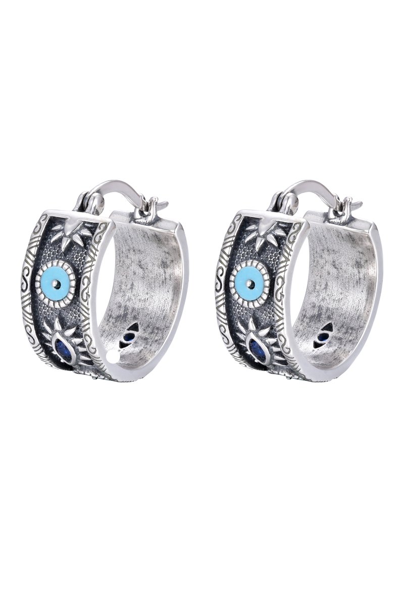 Créoles en argent serties de turquoises synthétiques.