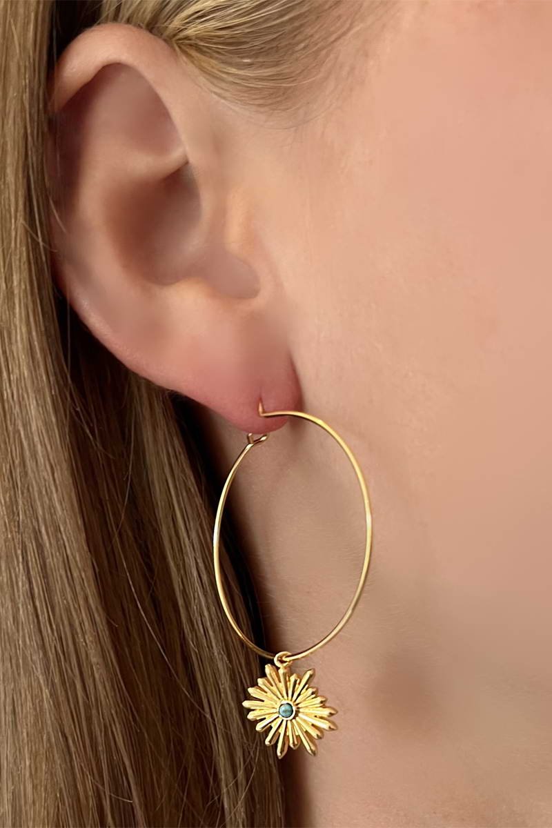 Créoles en argent doré à l'or fin jaune serties d'une turquoise synthétique.