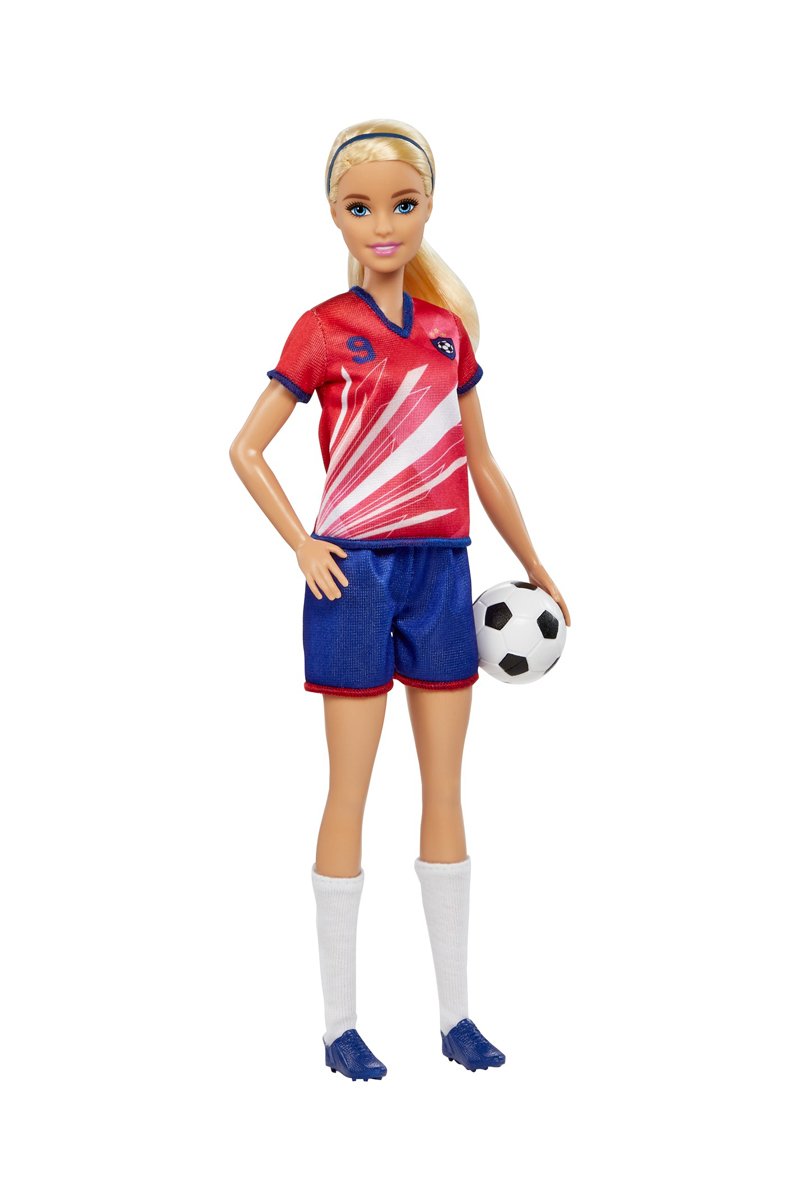 Barbie® footballeuse a des cheveux blonds coiffés en queue de cheval et possède une balle de foot.