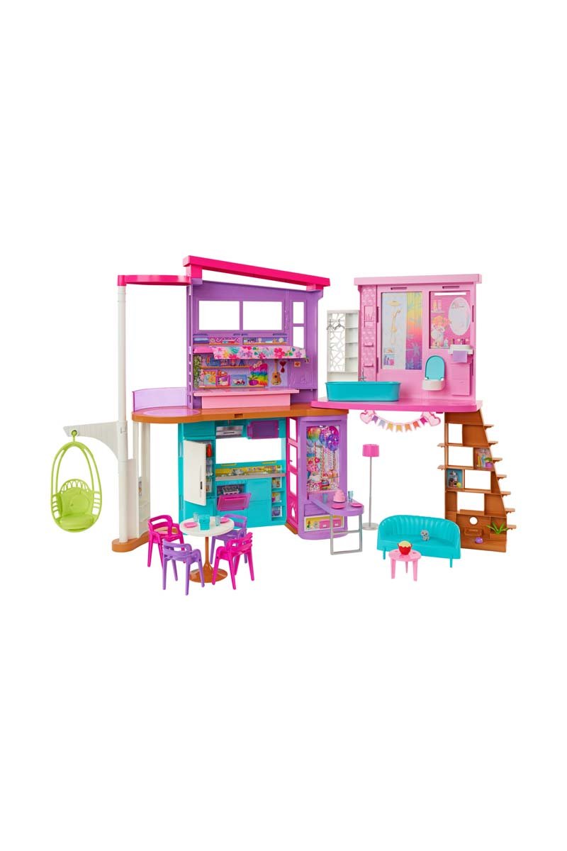 Cette maison Barbie® se prête à de nombreuses histoires avec son design moderne et tendance et ses fonctionnalités amusantes, comme un fauteuil suspendu qui sert d’ascenseur et un mur qui se relève et s’abaisse pour organiser une soirée film ou une fête d’anniversaire.