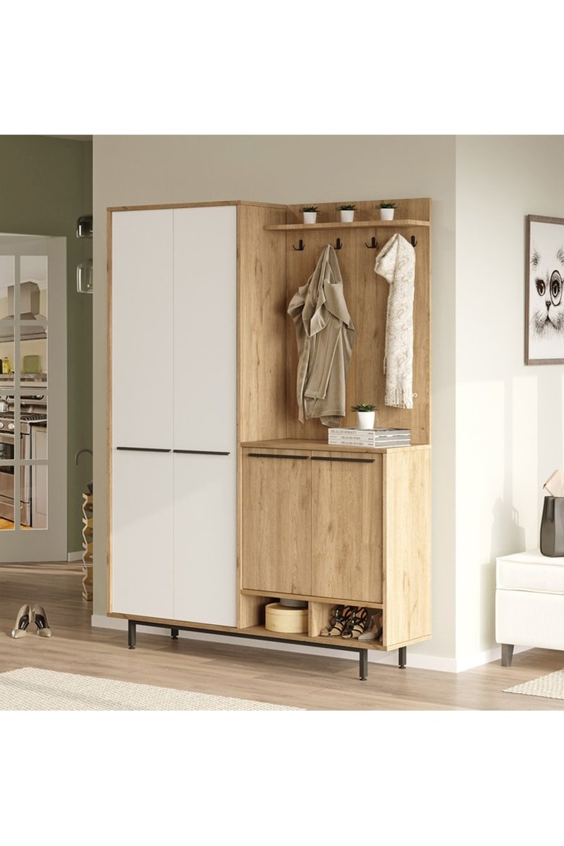 Meuble d’entrée 4 portes - Imitation chêne et blanc