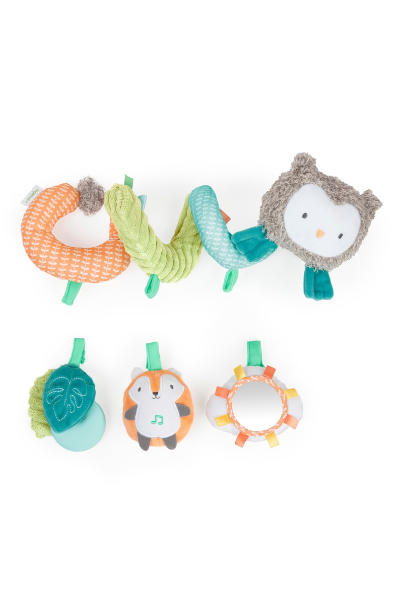 Jouets inclus : miroir soleil multi textures, avec étiquettes, jouet Kitt le renard reproduisant des mélodies apaisantes naturelles, un anneau de dentition en silicone sans BPA, des feuilles en tissu texturé.