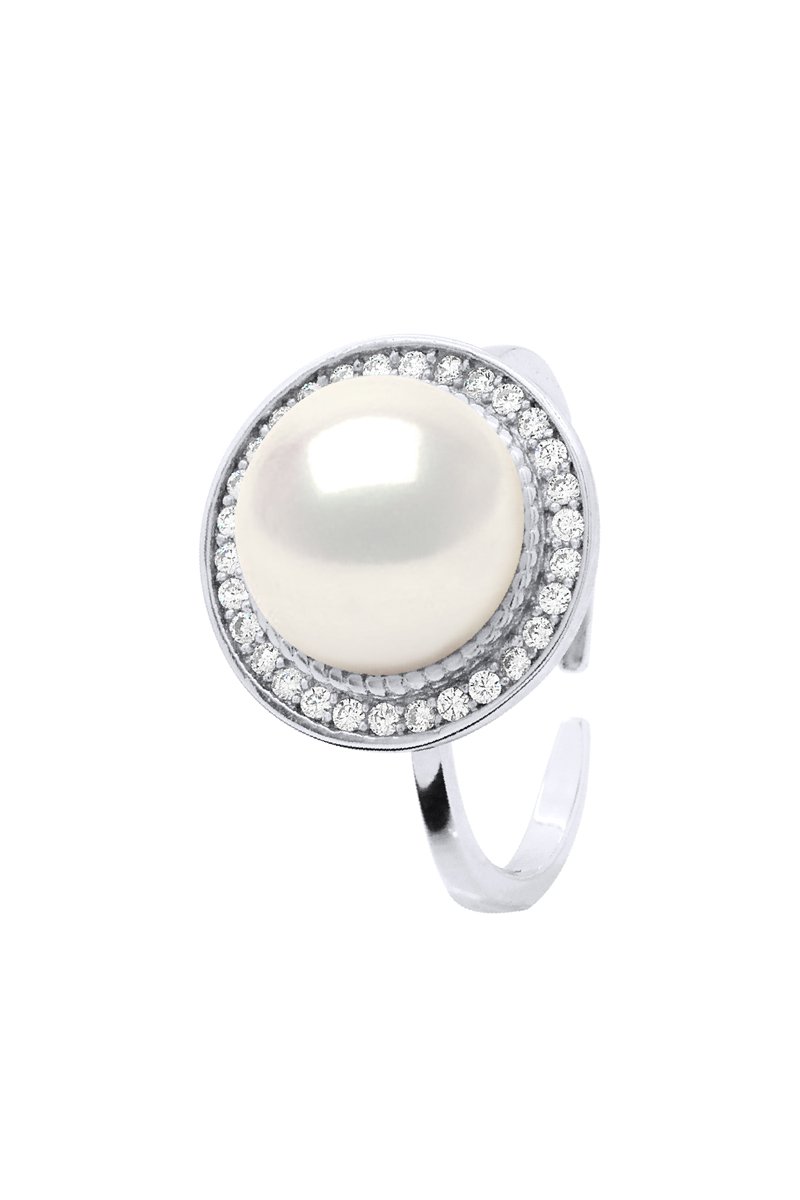 Bague réglable en argent sertie d’une perle de culture d’eau douce et d’oxydes de zirconium.