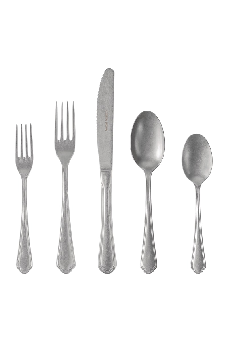 Couvert en acier inoxydable comprenant une fourchette à dessert, une fourchette de table, un couteau de table, une cuillère à soupe et une cuillère à dessert.