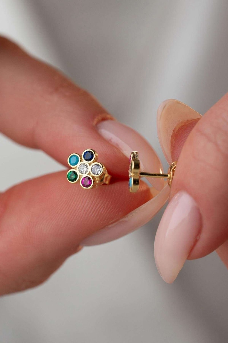 Puces en argent plaqué or jaune serties de 6 cristaux.