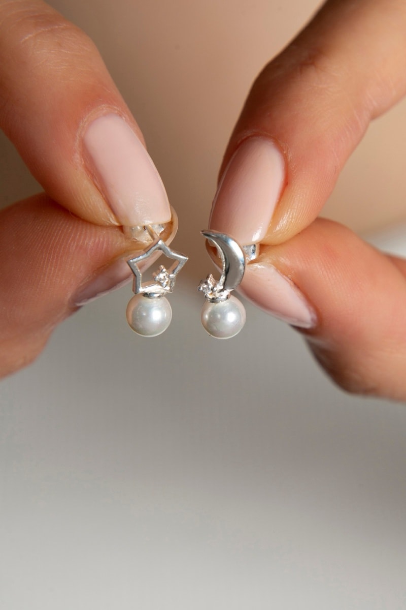 Boucles d'oreilles en argent sertie d’une perle d’imitation.