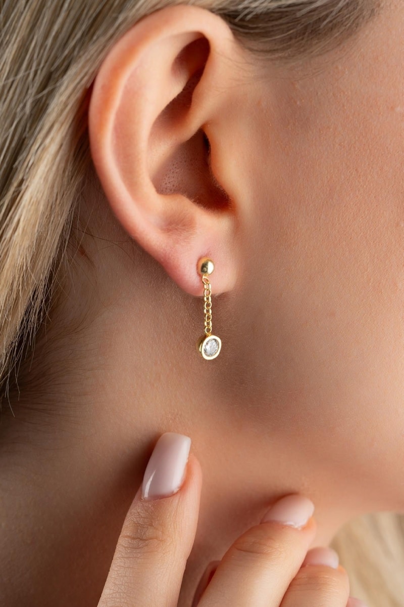 Boucles d’oreilles pendantes en argent plaqué or jaune serties d’un zircon.