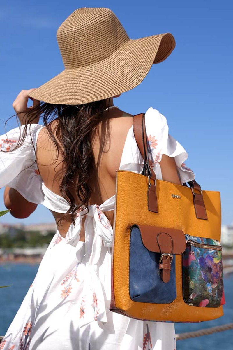 2 poches : 1 zippée à motifs fleurs et 1 à rabat avec bride à boucle et logo métallique devant.