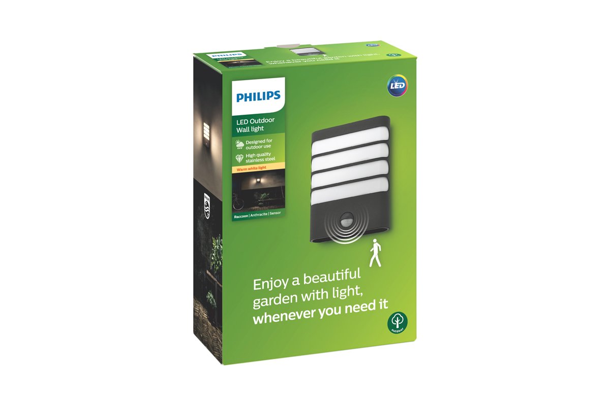 L'applique murale extérieure Raccoon de Philips, de couleur anthracite, s'allume automatiquement lorsque quelqu'un passe à proximité.