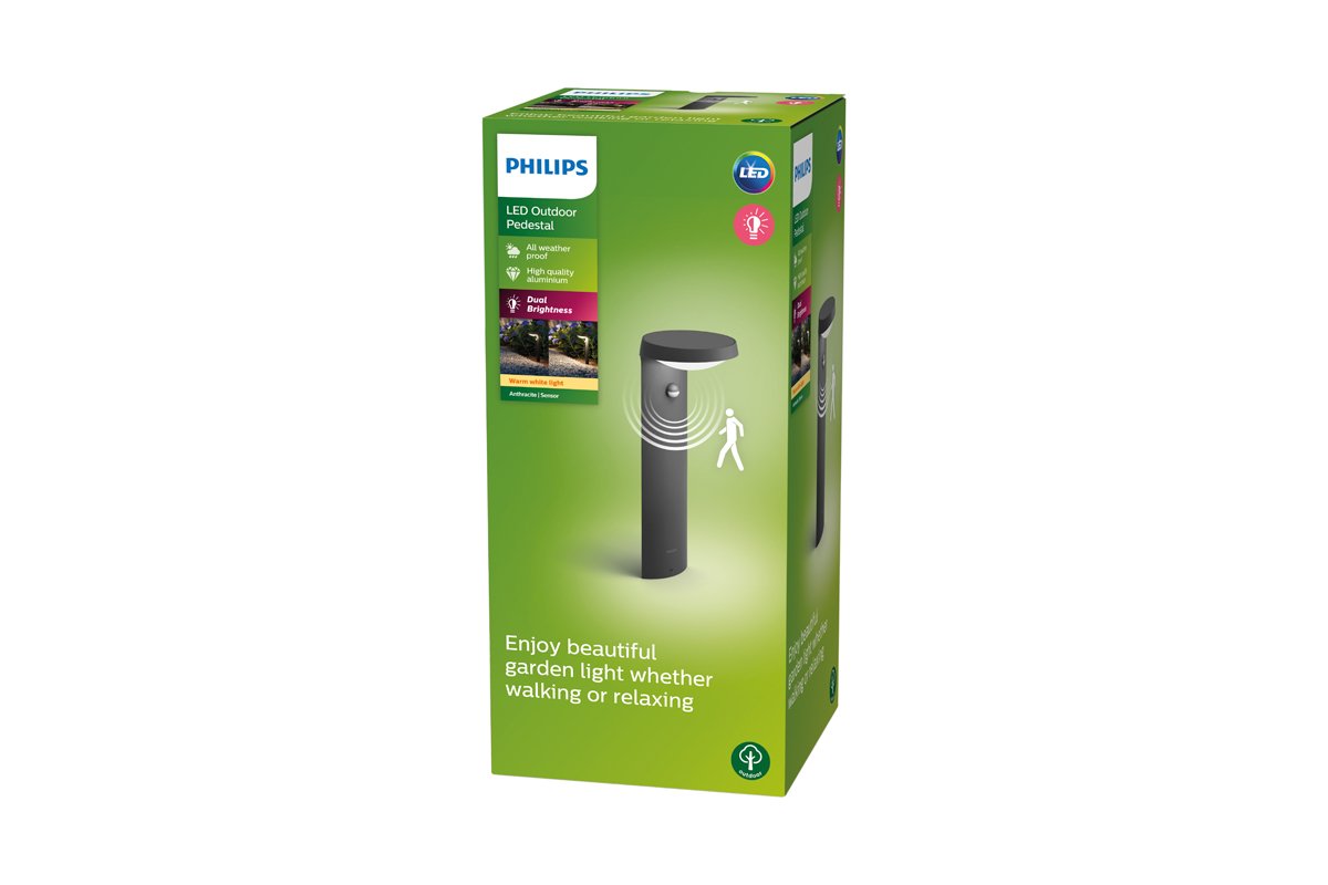 La borne LED Philips Tyla avec détecteur de mouvement intégré émet automatiquement une lumière blanc chaud lorsqu'un mouvement est détecté le soir et est éteint pendant la journée.