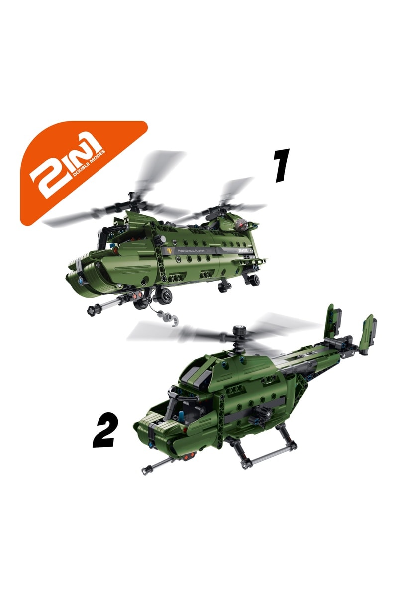 Ce jeu de construction permet d'assembler 393 pièces pour créer 2 modèles différents : un hélicoptère de transport militaire et un hélicoptère classique.