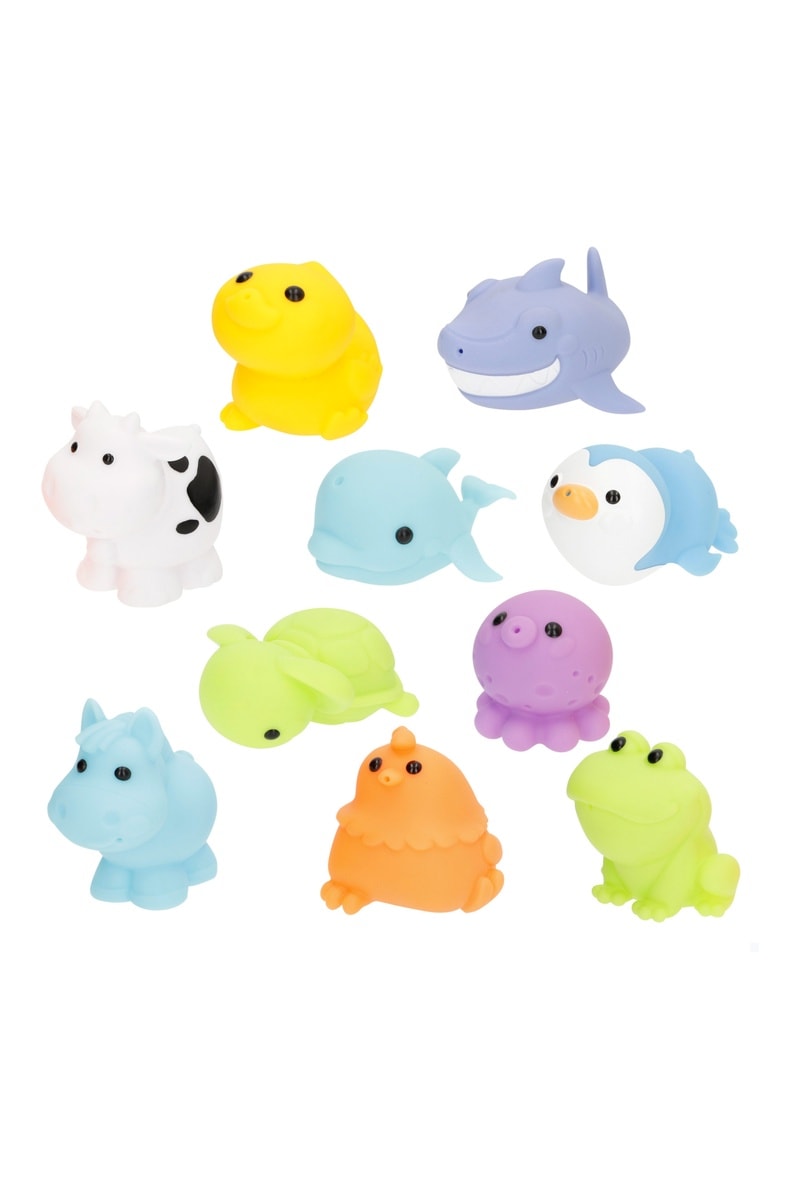 Ce jouet se compose de 10 animaux de bain en plastique souple, conçus pour être pressés et pour éclabousser l'eau.