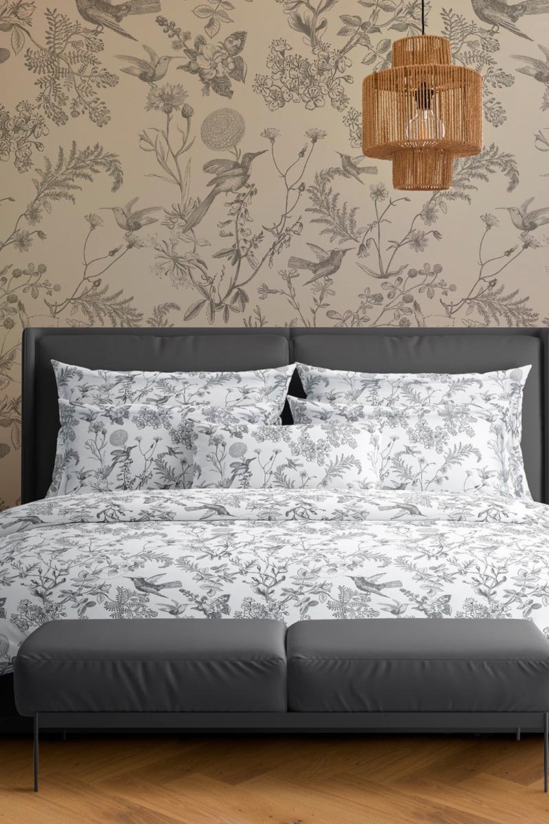Parure de couette en satin de coton 80 fils/cm² Colibri botanique - Blanc et noir