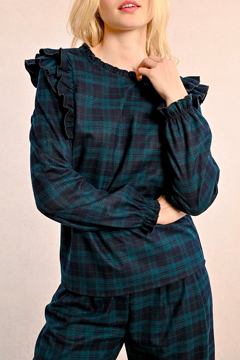 Volants à l'encolure, sur les manches, devant et au dos.