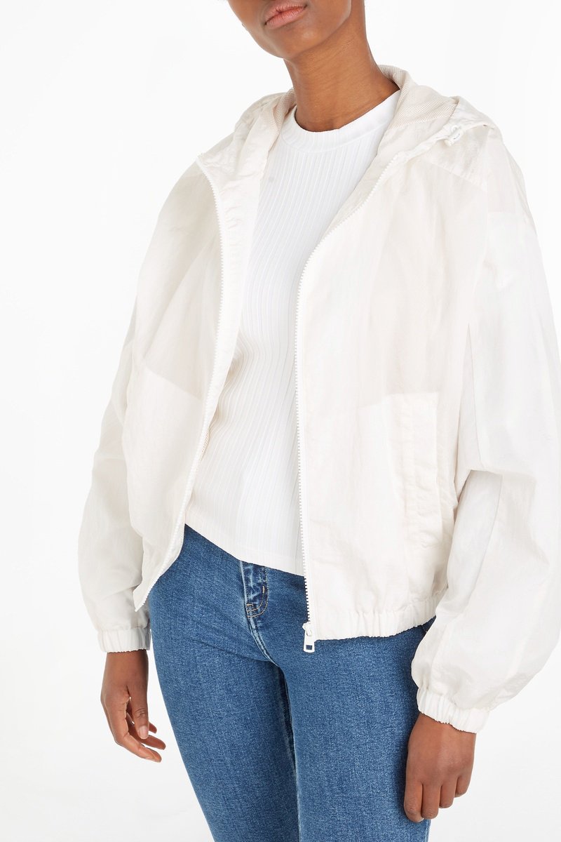Coupe-vent à capuche avec liens de serrage et barillets.