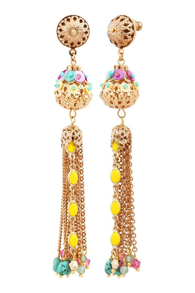 Boucles d'oreilles pendantes dorées à l’or jaune serties de cristaux et d’aventurines.