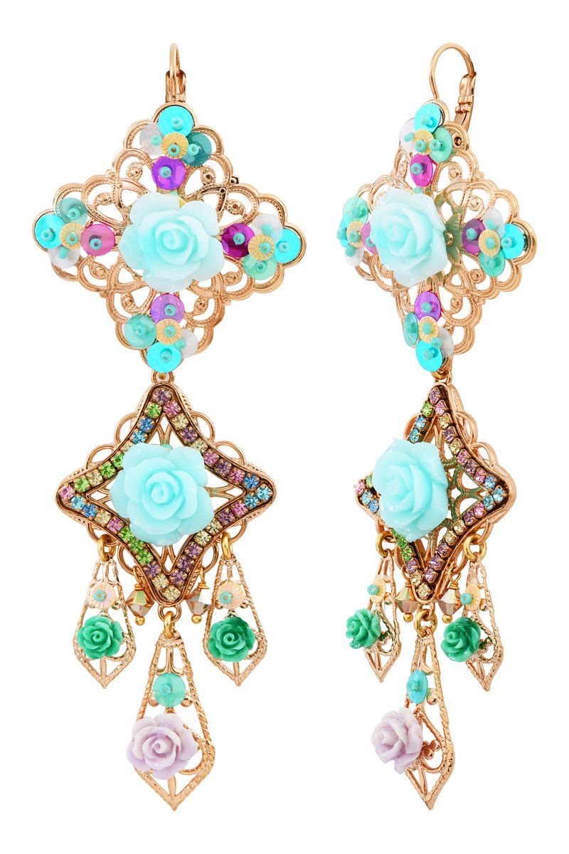 Boucles d'oreilles pendantes dorées à l’or jaune serties de cristaux et de nacres reconstituées.