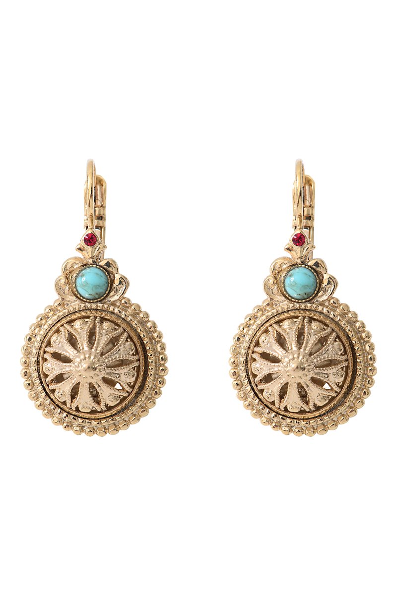 Boucles d'oreilles pendantes dorées à l'or fin et serties d'un cabochon et de cristaux.