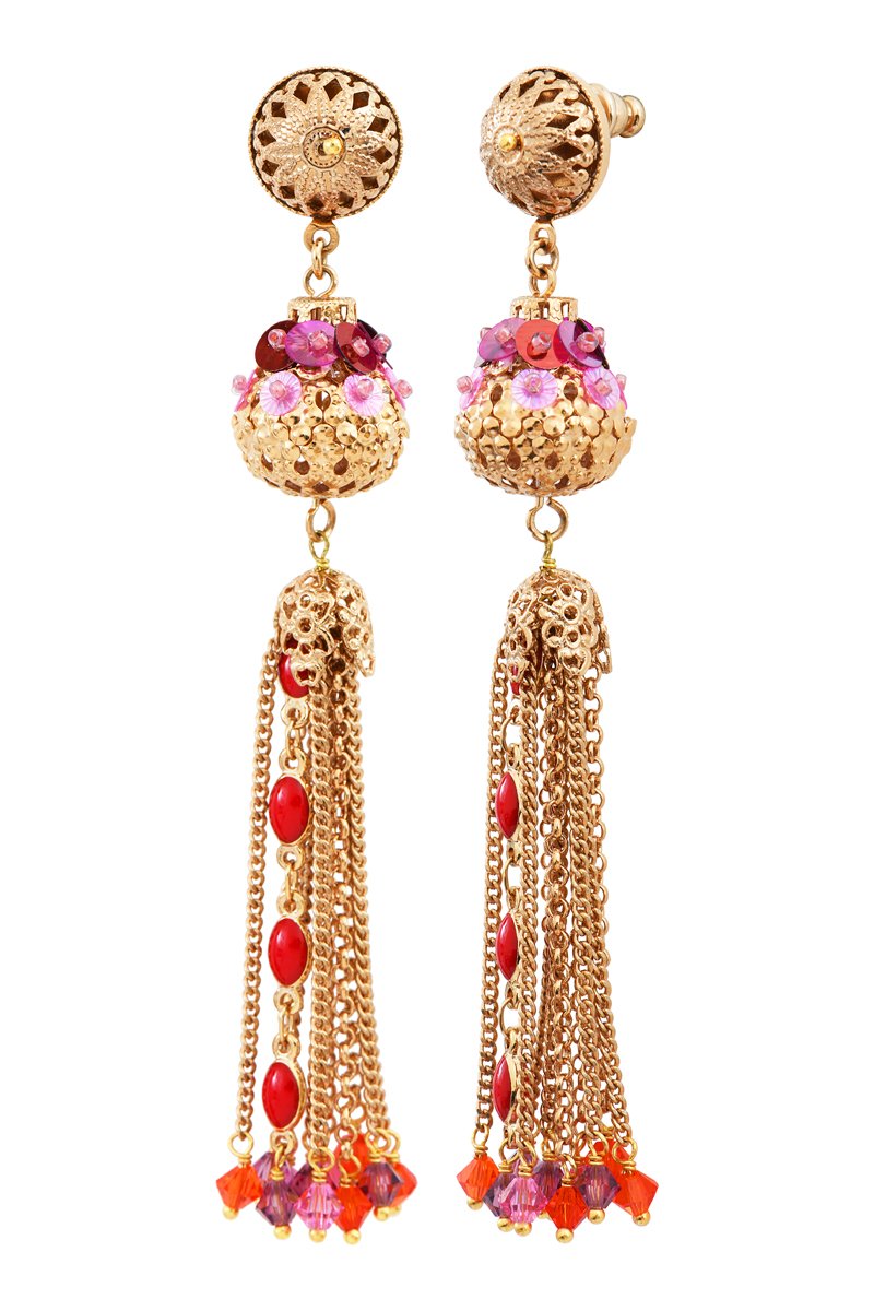Boucles d'oreilles pendantes dorées à l’or jaune serties de cristaux.