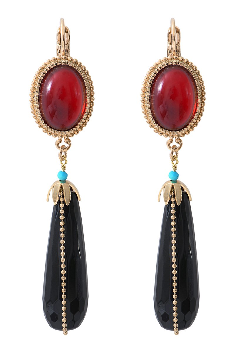 Boucles d'oreilles pendantes dorées à l'or fin et serties d'onyx, d'une turquoise et d'un cabochon.