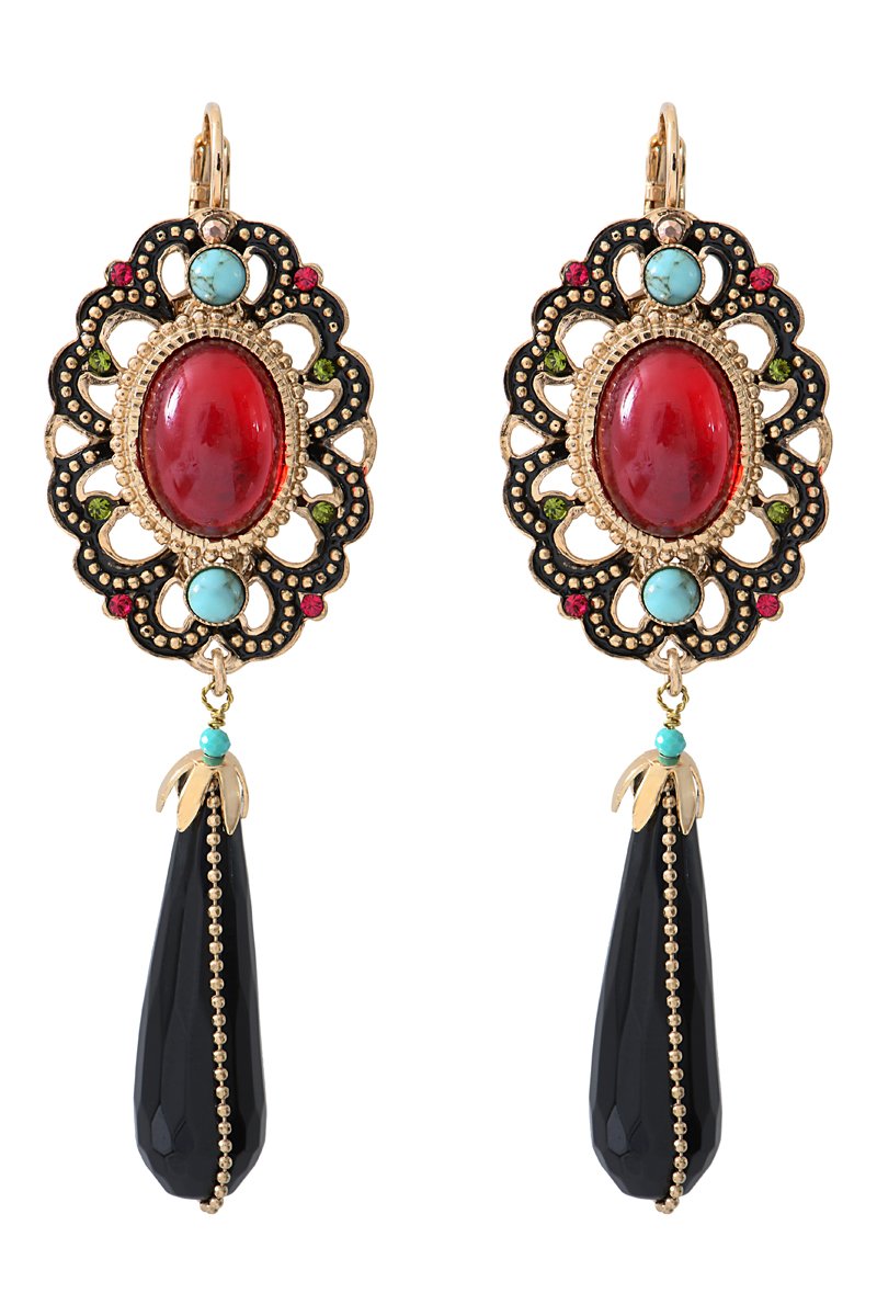 Boucles d'oreilles pendantes dorées à l'or fin et serties d'onyx, d'une turquoise, d'un cabochon et de cristaux.