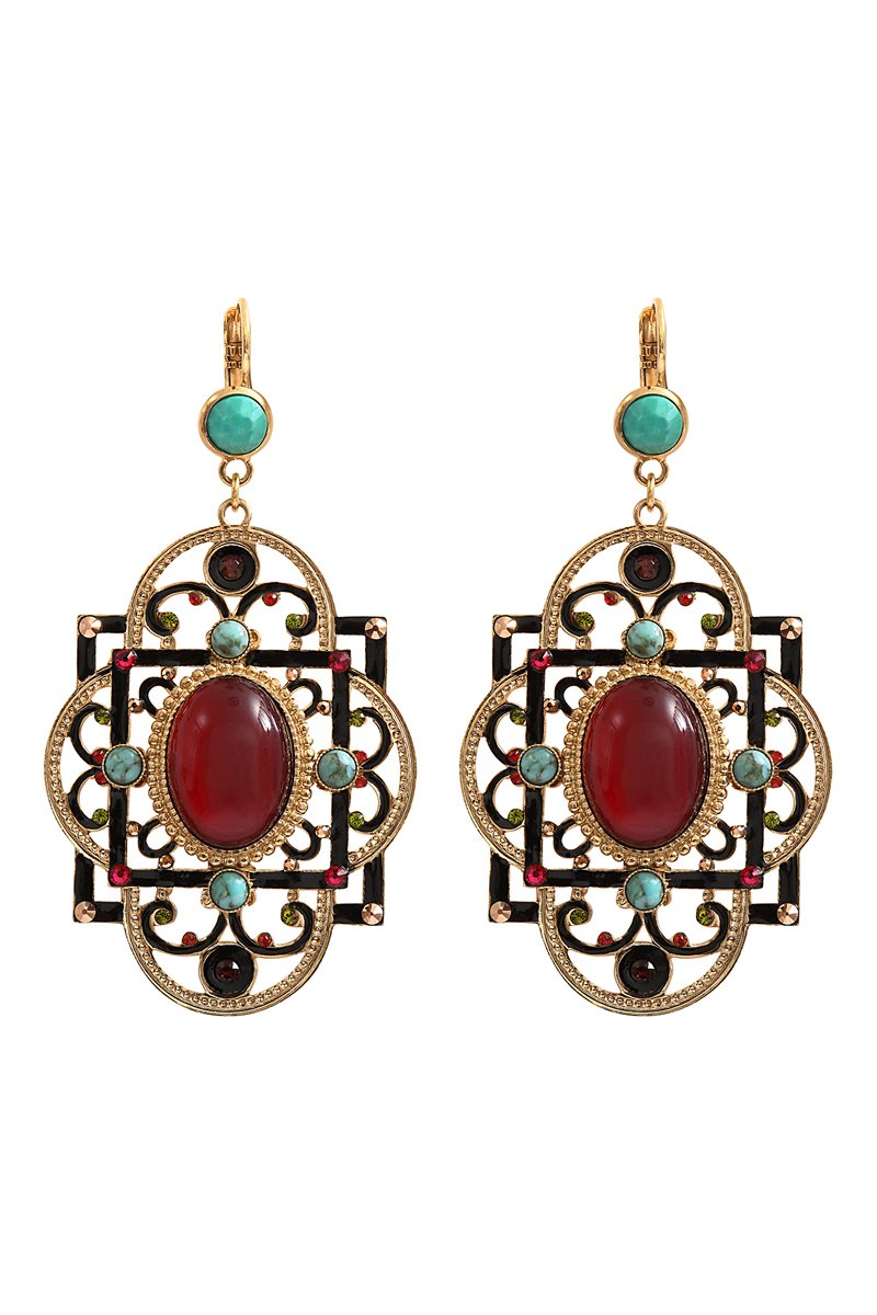 Boucles d'oreilles pendantes dorées à l'or fin serties d'amazonite, d'un cabochon et de cristaux.