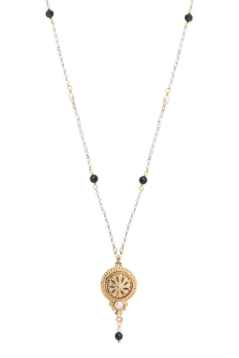 Collier doré à l'or fin et serti d'onyx et de perles de rivière.