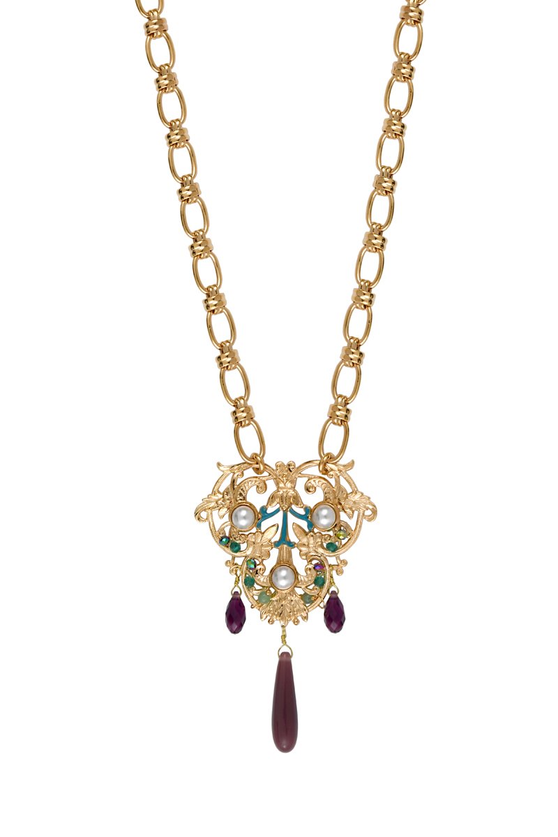 Pendentif serti d’un cabochon, d’une aventurine et perle d’imitation.