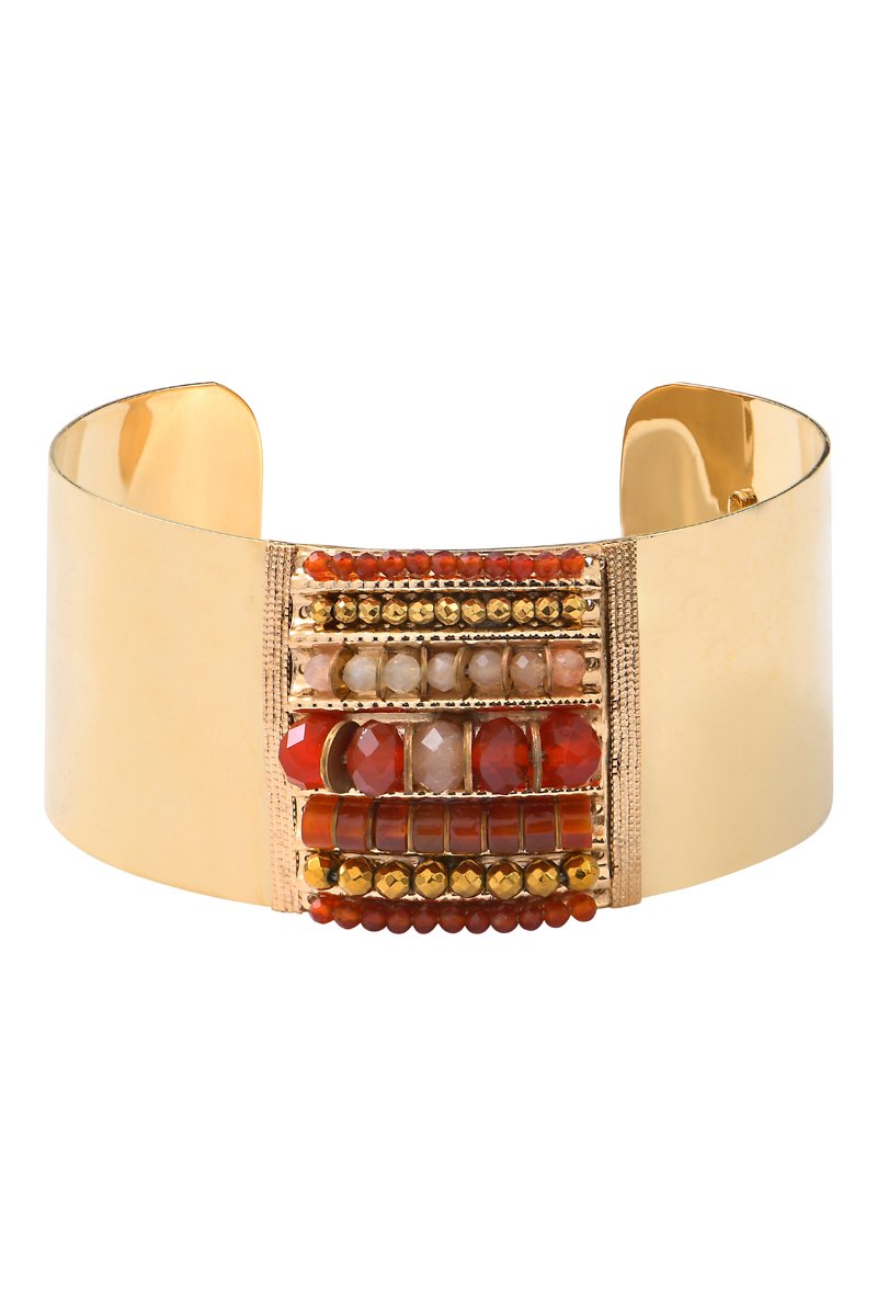 Manchette ouverte dorée à l'or jaune sertie de cornalines, de pierres de soleil et d'hématites.