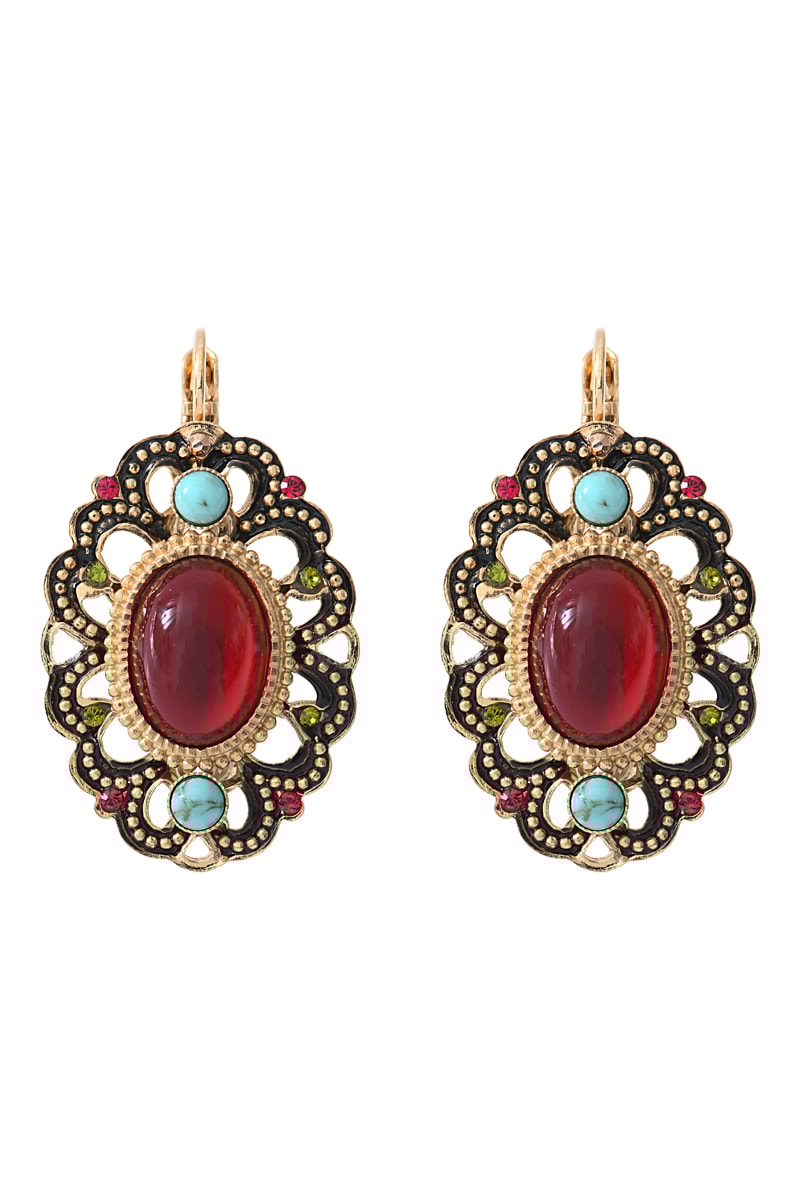 Boucles d’oreilles dorées à l’or fin jaune serties d’un grenat, de 2 turquoises, de péridots et de cristaux.