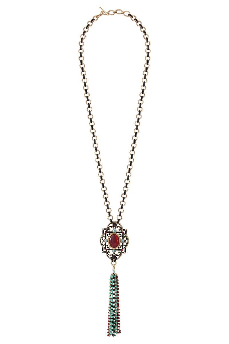 Pendentif serti d’onyx, de turquoises, de péridots, de perles d’imitation et d’un grenat.