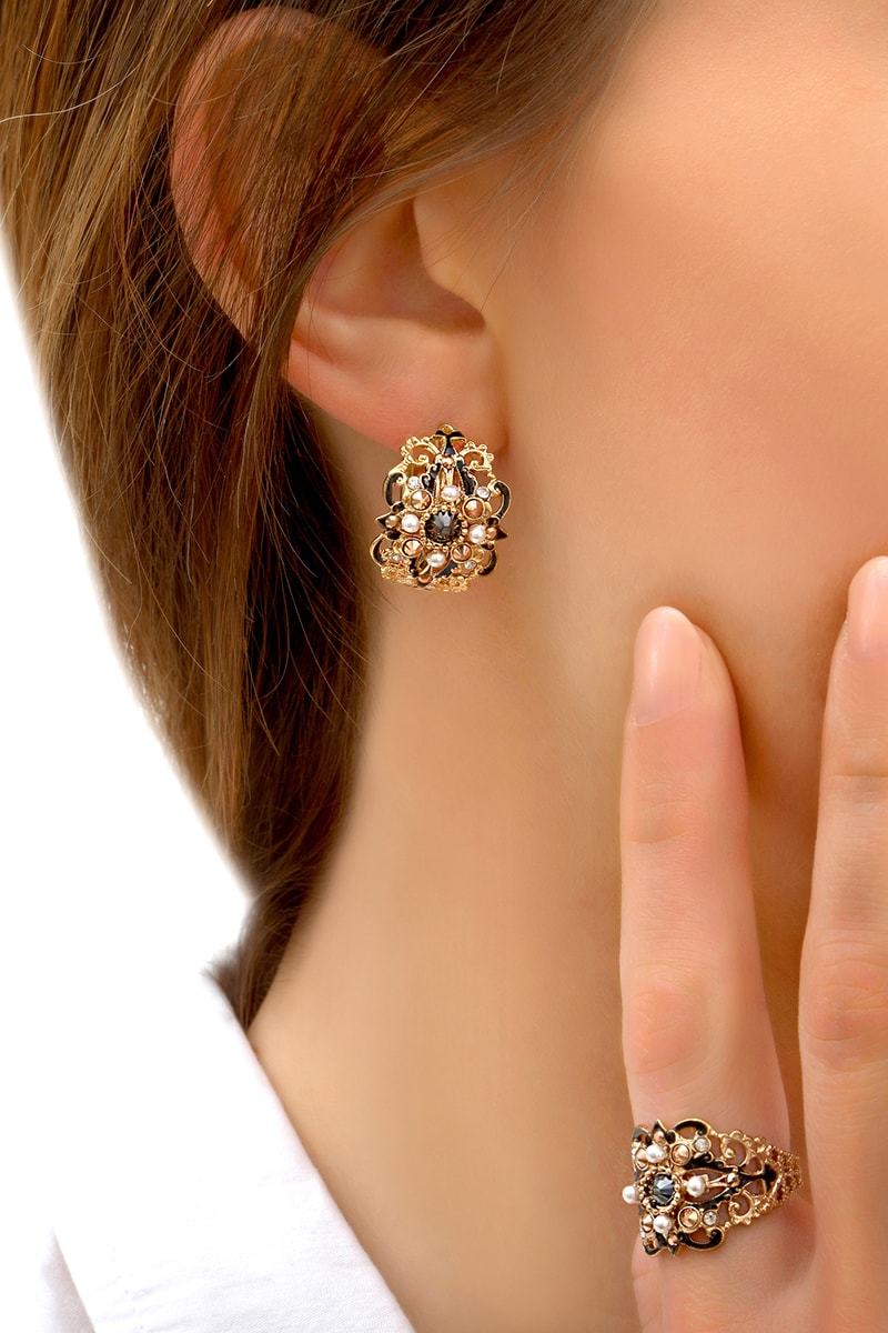 Matière : métal doré à l’or fin jaune, émail, onyx, perles de culture d’eau douce et cristaux