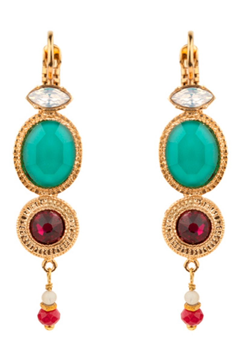 Boucles d’oreilles pendantes dorées à l'or fin jaune serties de nacre, d’un jade, d’une hématite, de cristaux et ornées de cristaux de Swarovski®.