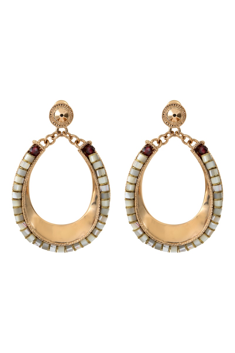 Créoles dorées à l’or fin jaune serties de nacre et de 2 grenats.