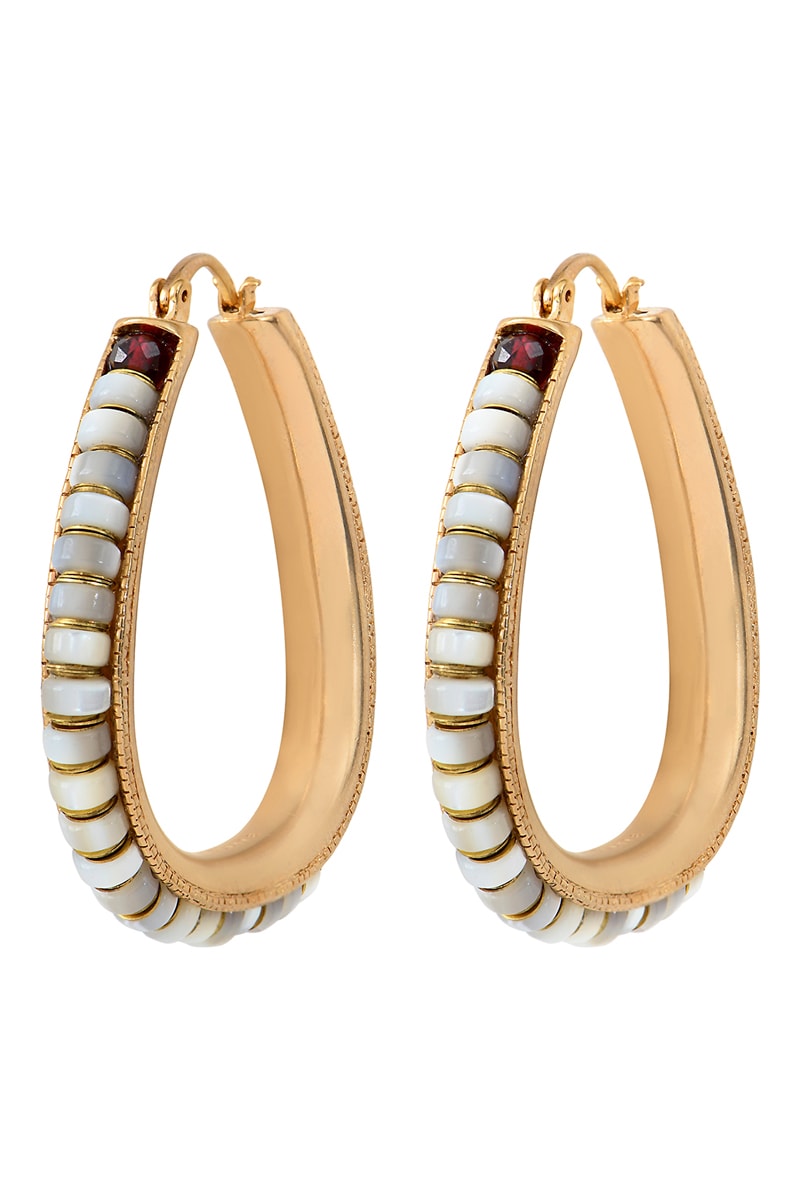 Créoles dorées à l’or fin jaune serties de nacre et d'un grenat.
