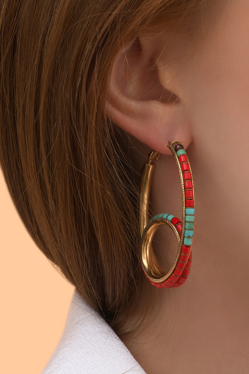 Créoles dorées à l’or fin jaune serties d’un grenat, de turquoises et perles japonaises.
