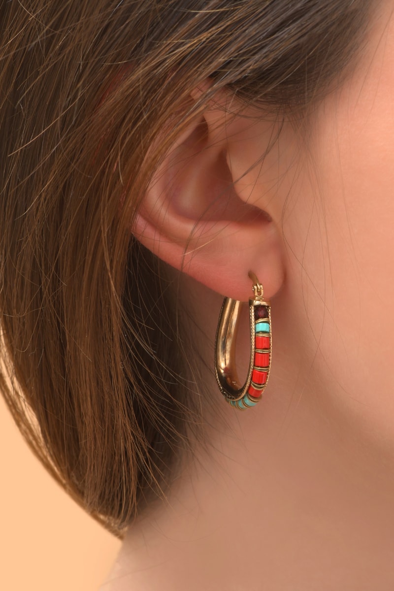 Créoles dorées à l’or fin jaune serties d’un grenat, de turquoises et perles japonaises.