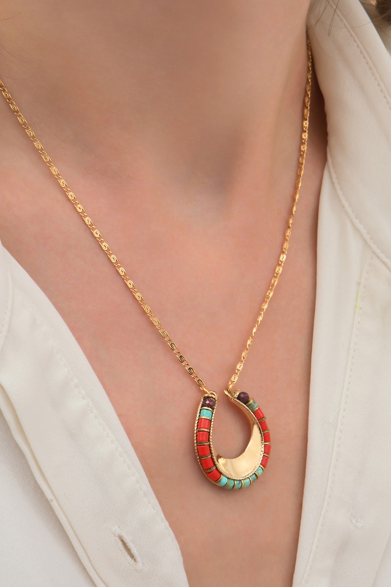 Pendentif serti de turquoises, perles japonaises et 2 grenats.