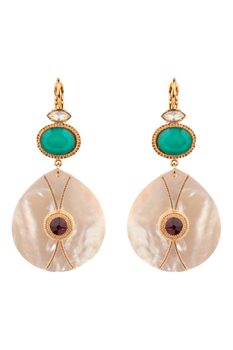 Boucles d’oreilles pendantes dorées à l'or fin jaune serties de nacre, de cristaux et ornées de cristaux de Swarovski®.